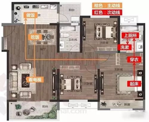 戶型動(dòng)線是指人在戶內(nèi)活動(dòng)的路線,好的動(dòng)線能夠提升戶型利用率,進(jìn)而提高人們的居住品質(zhì)。戶內(nèi)動(dòng)線主要有三種,分別是居住動(dòng)線、家務(wù)動(dòng)線、來(lái)客動(dòng)線。良好的動(dòng)線是指從入戶門進(jìn)客廳、臥室、廚房的三條線不會(huì)交叉。