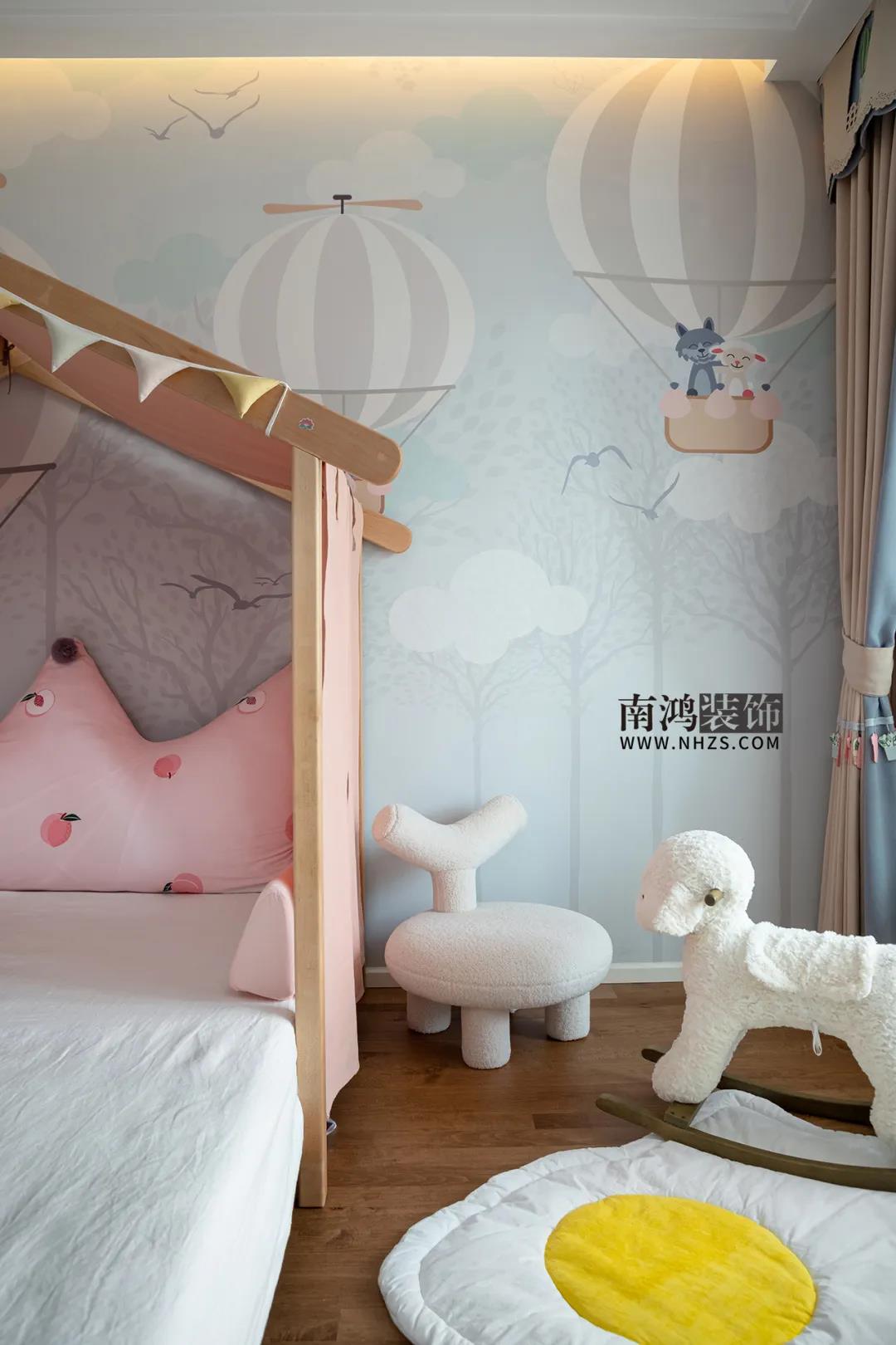 兒童房二。另一間兒童房的布置也是充滿了孩子喜愛的各種元素,色彩活潑,另外,為滿足孩子未來更多的成長需求,設(shè)計(jì)師也做了一定的留白空間。