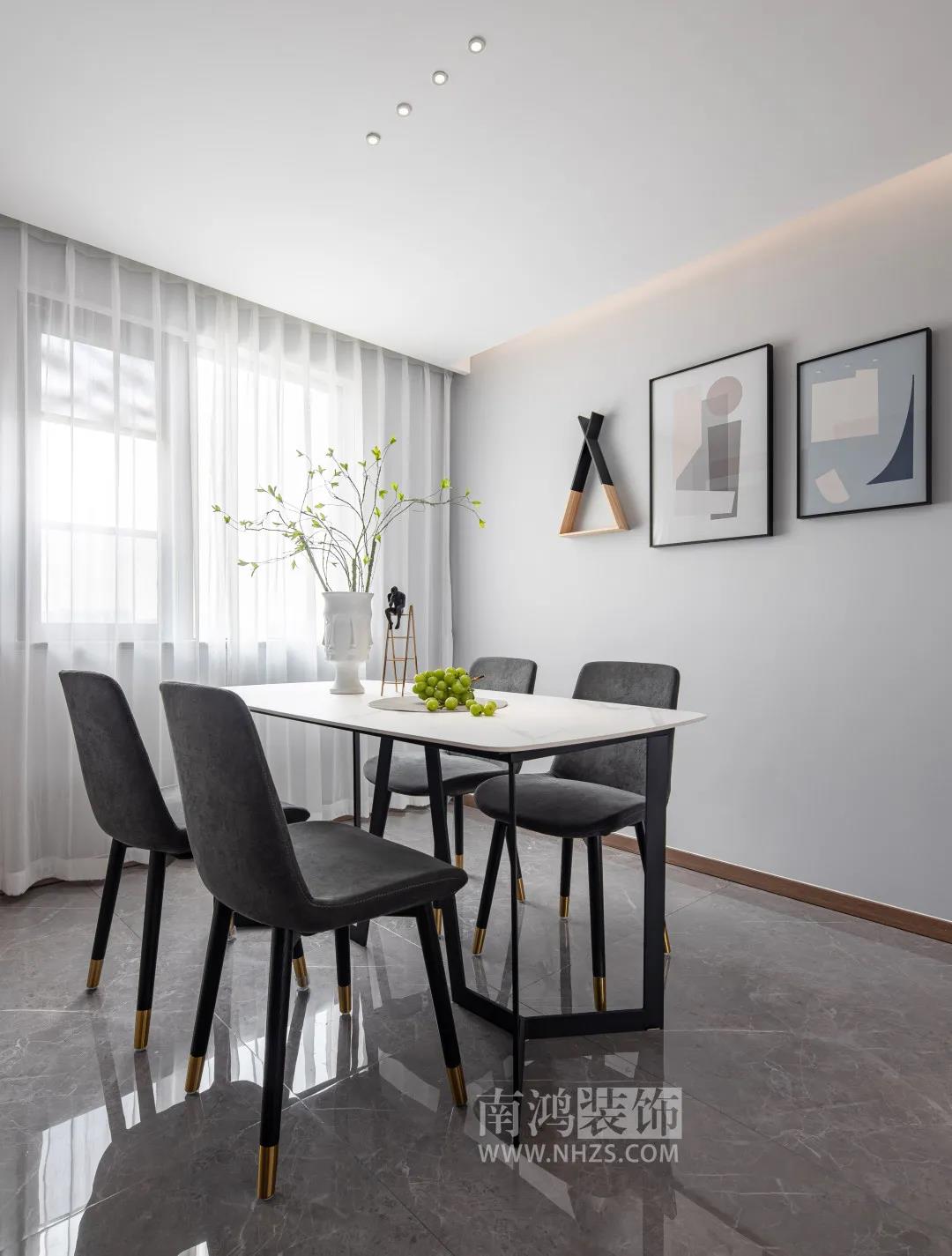 地址 / 締壹城 戶型 / 四室兩廳 面積 / 135㎡ 風(fēng)格 / 現(xiàn)代風(fēng)格 設(shè)計(jì)施工 / 浙江南鴻裝飾 本案為寧波締壹城現(xiàn)代風(fēng)格作品。業(yè)主是一對(duì)年輕夫妻,家里有一雙尚年幼的兒女,他們希望這個(gè)新家能融合許多時(shí)尚前衛(wèi)的小細(xì)節(jié)。 本案的材質(zhì)選用有大理石磚、木飾面、不銹鋼條、硅藻泥等,配以大量輔助光源來(lái)打造業(yè)主的理想居所。 戶 型 圖 客 廳 Living Room 客廳足夠簡(jiǎn)潔敞亮,陽(yáng)臺(tái)被包進(jìn)來(lái)做抬高處理,成為一處不錯(cuò)的休閑場(chǎng)所。家具挑選得都較為低矮,無(wú)形中拉伸了層高,也讓空間更為通透。 電視背景墻選用爵士白大板磚背景結(jié)合金色不銹鋼打造的開放柜,個(gè)性突出,木質(zhì)的地柜與木格柵元素?fù)诫s進(jìn)溫潤(rùn)的視感,平衡了冷暖溫度。 三幅組合裝飾畫懸掛于沙發(fā)背景墻,干凈明晰,不著多余的色彩,挺拔的綠植安靜地立于一側(cè),默默為空間注入清新之感,灰色主沙發(fā)完美契合基調(diào)。 客廳望向餐廳。頂部是無(wú)主燈設(shè)計(jì),燈光也要貼合現(xiàn)代風(fēng)格的簡(jiǎn)潔特征。 餐 廳 Dining Room 餐廳,纖薄的石材桌面搭配簡(jiǎn)約風(fēng)的灰色餐椅,桌椅低調(diào)至簡(jiǎn),再配上白紗簾,頗有清風(fēng)徐來(lái)的唯美之意。 廚 房 Kitchen 廚房面積雖有限,使用起來(lái)可一點(diǎn)兒不會(huì)拘束,L型的結(jié)構(gòu)最大化利用了空間又讓動(dòng)線足夠流暢。深灰的櫥柜搭配黑色拉手,簡(jiǎn)潔又大氣。 臥 室 Bedroom 將飄窗擴(kuò)進(jìn)后,主臥的采光與視野變得更好,整體使用白與灰的配色,溫柔寧?kù)o。如此賞心悅目的臥室,可以讓人快速放松身心,卸去疲憊。 兒童房用清新的藍(lán)調(diào)布置背景,可愛的小動(dòng)物圖案契合孩子幼小純真的心性,整體色彩沒有艷麗的感覺,卻足夠有趣分明。 書 房 Study 書房的布置比較簡(jiǎn)單,以實(shí)用為主,柜子均是現(xiàn)場(chǎng)制作。木材細(xì)膩的光澤感,仿佛天生就自帶了一層柔光濾鏡。 衛(wèi) 生 間 Toilet 兩個(gè)衛(wèi)生間在風(fēng)格上是統(tǒng)一的,黑色的粗線條邊框牢牢占住視線,鏡子旁的開放式層架、墻上的壁龕及懸空的浴室柜設(shè)計(jì),讓空間實(shí)用又美觀。