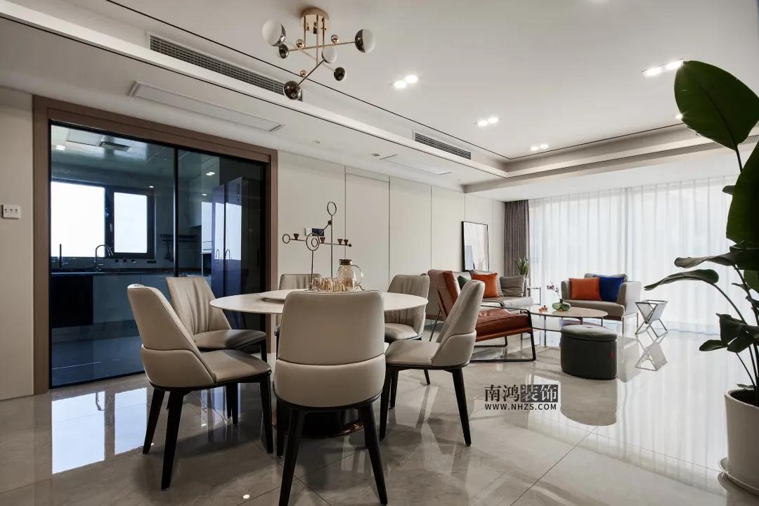 項(xiàng)目信息 地址 / 五幸家園 戶型 / 四室兩廳 面積 / 146㎡ 風(fēng)格 / 現(xiàn)代輕奢 設(shè)計(jì)施工 / 浙江南鴻裝飾 ▽原戶型優(yōu)劣勢 Ⅰ優(yōu)勢:有大陽臺,采光充足;房屋布局比較合理,動靜分區(qū)。 Ⅱ劣勢:廚房面積太??;主衛(wèi)是暗衛(wèi);沒有足夠的儲物空間。 ▽優(yōu)化改動 1、針對公空間區(qū)域,擴(kuò)大廚房面積,更改書房進(jìn)門方向,并打通客廳與陽臺,使客餐廚幾塊區(qū)域的空間利用更加合理。 2、長輩房利用外機(jī)位的位置,與兒童房相連的墻體改動,增加了兩組儲物柜。 3、移動兒童房墻體,主臥得以增加了一個(gè)衣帽間。主衛(wèi)門改變朝向,擴(kuò)大使用面積。 在分析了戶型、了解了客戶需求和喜好的基礎(chǔ)上,設(shè)計(jì)師用了大面積的灰調(diào)和白色等中性色作為基礎(chǔ)色,用跳脫的橘色和綠色作為點(diǎn)綴,烘托空間的精致氛圍感。 木色、米色、灰色加局部亮色點(diǎn)綴,突出質(zhì)感的同時(shí)又能很好的融合家庭溫馨的感覺,符合業(yè)主的低調(diào)輕奢上檔次的預(yù)期。 由于家里常住人口較多,因此在收納上也下足了功夫。同時(shí)巧妙應(yīng)用了大理石、巖板、木格柵飾面,絨面、金屬等材質(zhì),別具一格的軟裝細(xì)節(jié)和色彩變化,既滿足了一家對居住體感的舒適度需求,又創(chuàng)造出不拘一格的視覺盛宴。 客 廳 客廳納入陽臺,擴(kuò)大使用面積并增加采光。溫和的米白色主調(diào)搭配輕奢系軟裝布置,讓視覺無比明朗舒適。 客廳與陽臺打掉的隔墻上有一道很低的梁,我們并沒有將兩側(cè)背景墻直接做到吊頂?shù)撞?,而是選擇留出一截高度,這樣既能弱化梁位又不會犧牲層高。 硬朗的大理石與皮藝、絨布材質(zhì)結(jié)合,提升客廳的細(xì)節(jié)質(zhì)感,軟裝上點(diǎn)綴跳色,讓空間不致單調(diào)。 客餐相鄰,通往書房的地方做隱形門處理,整體背景墻效果得到統(tǒng)一,視覺延伸感極好。 餐 廳 △裝修前 △裝修后 餐廳,高顏值的白色巖板餐桌用來搭載美味料理,皮質(zhì)餐椅柔和可親,精致的金屬元素則貫穿始終。 餐廚之間以玻璃移門隔絕油煙,背景墻定制餐邊柜分擔(dān)收納功能,簡約時(shí)尚的用餐環(huán)境圍塑出最幸福的人間煙火。 廚 房 廚房經(jīng)過調(diào)整后面積擴(kuò)大,黑白灰三色比例完美協(xié)調(diào),黑色巖板臺面厚薄適中,易于打理,白色的無把手柜門則讓視覺的純凈感達(dá)到極致。 臥 室 △裝修前 △裝修后 主臥延續(xù)優(yōu)雅的輕奢格調(diào),皮藝硬包背景與床體適配和諧,空間語言以它獨(dú)有的方式巧妙傳達(dá)著愜意的延伸。 主衛(wèi)朝向睡眠區(qū)的墻面做了一塊電子霧化玻璃,借此改善內(nèi)部采光。 △裝修前 △裝修后 長輩房,整體搭配簡約大方,儲物柜門做凹槽,無把手設(shè)計(jì)更顯空間整潔。 長長的飄窗作為平日里的休閑一角~ 男孩房,藍(lán)色系床品搭配留白的灰色背景,安穩(wěn)中又透著活力童趣,靠近陽臺一側(cè)規(guī)劃出孩子的學(xué)習(xí)區(qū)域。 書 房 書房一角,滿滿的柜子提供豐富的收納空間,明黃色小沙發(fā)搭配色彩豐富的地毯,這兒想必也是孩子最愛的活動場所。 衛(wèi) 生 間 主衛(wèi),墻地面通鋪灰色大理石瓷磚,白色雙臺盆+鏡柜設(shè)計(jì),浴缸與淋浴區(qū)并排安置,充分滿足空間實(shí)用性與美觀度的雙向需求。 次衛(wèi)區(qū)域較狹長,我們做了干濕分離,留出雙臺盆的空間提升使用效率。臺盆區(qū)納入洗衣機(jī),進(jìn)一步優(yōu)化家務(wù)動線。