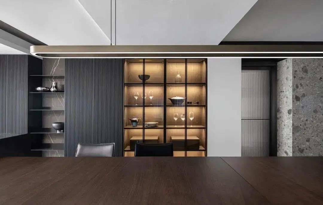 如果想進一步提升裝飾效果,可將線性光源穿插在木格柵之中,讓空間能在光影中盡顯朦朧雅韻~